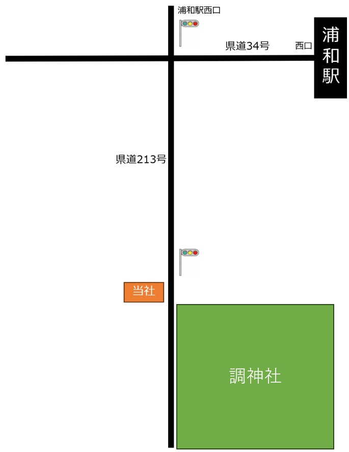 浦和駅西口を出て、県道34号を西に進みます。浦和駅西口交差点を左折し、400mほど歩くと弊社があります。調神社手前の信号を超えたところ右手にございます。